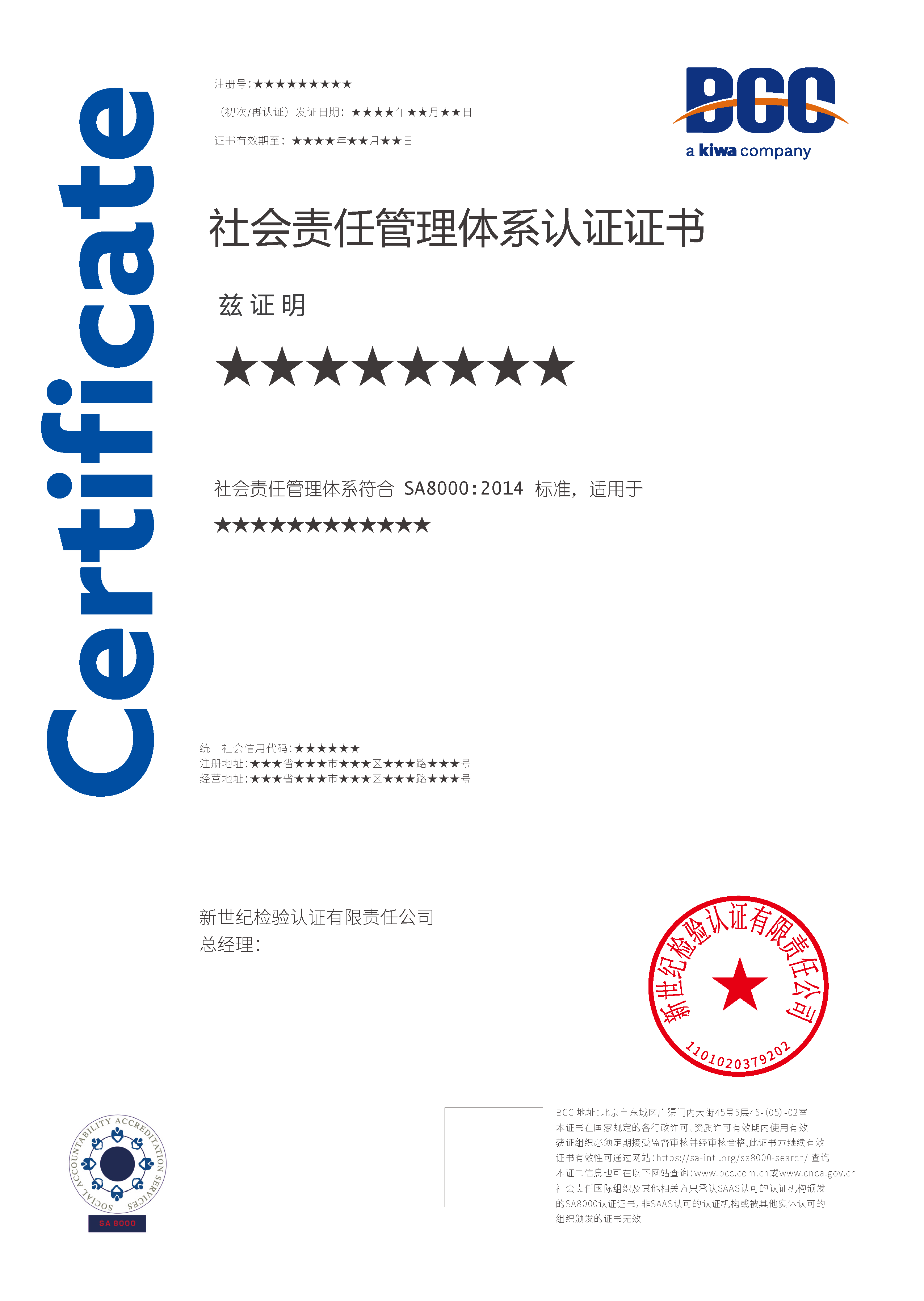 現(xiàn)行SA8000認(rèn)證使用的標(biāo)準(zhǔn)是SA8000:2014,該標(biāo)準(zhǔn)是由美國(guó)SAI(社會(huì)責(zé)任國(guó)際組織)制定發(fā)布的。SA8000標(biāo)準(zhǔn)涵蓋九個(gè)方面:童工、強(qiáng)迫勞動(dòng)、健康與安全、結(jié)社自由及集體談判的權(quán)利、歧視、懲罰措施、工作時(shí)間、報(bào)酬和管理體系。