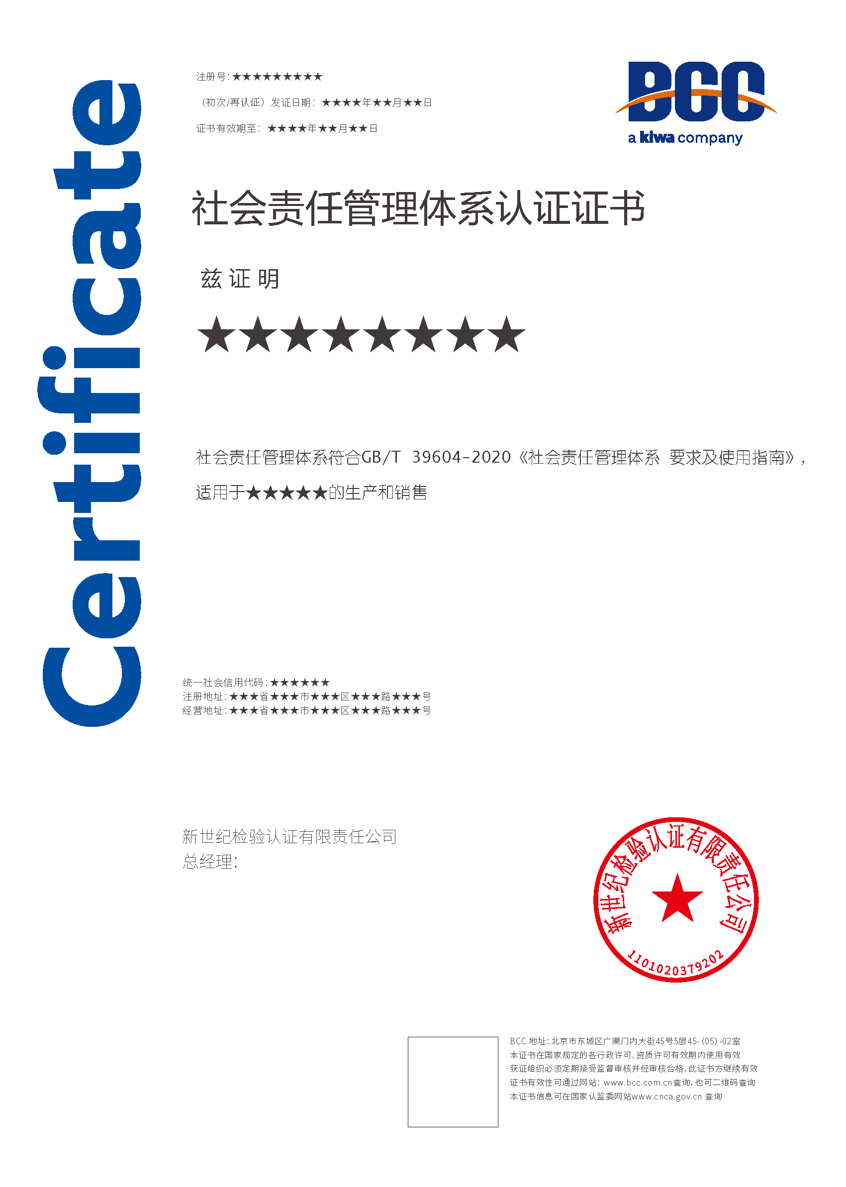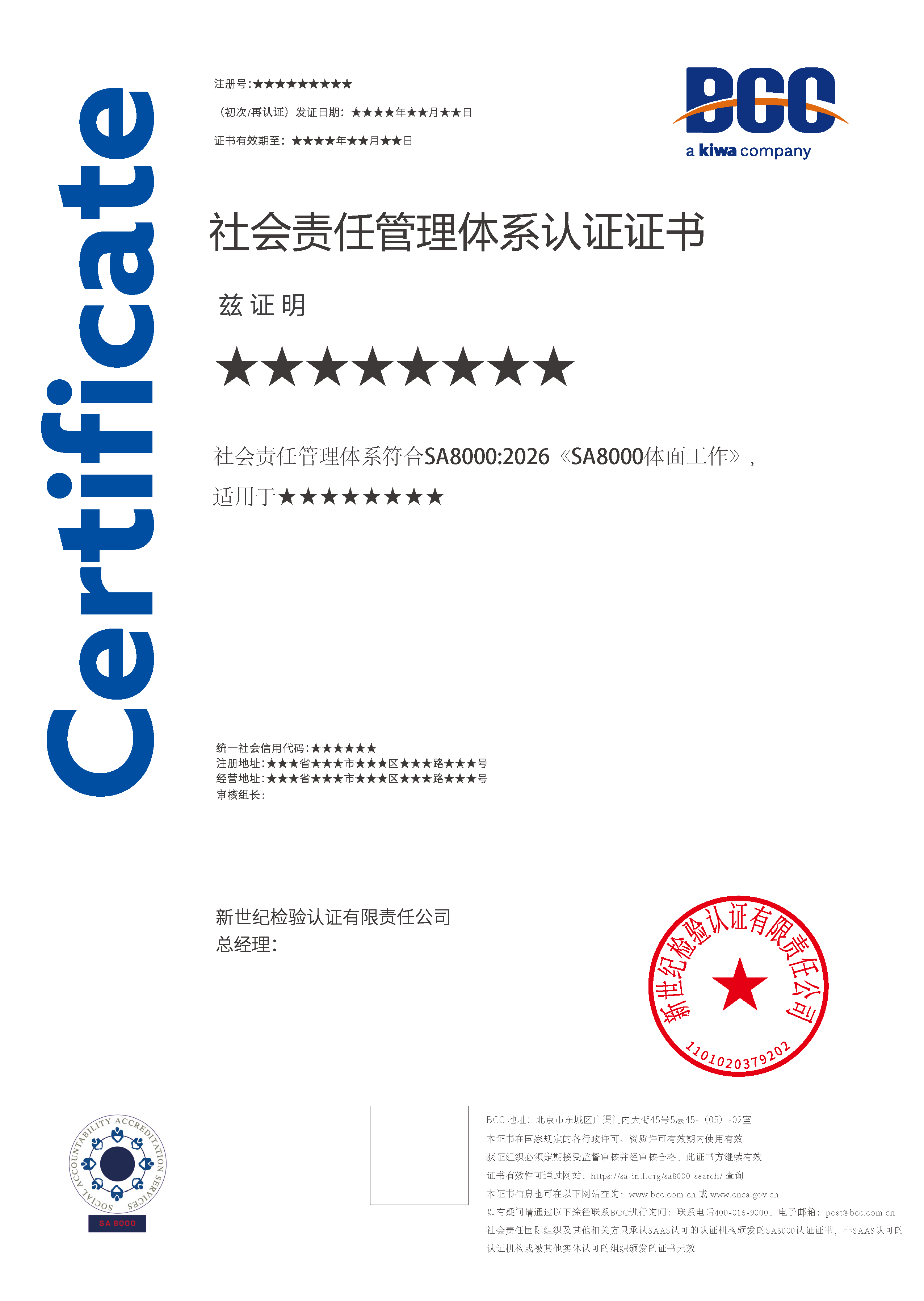社會責任管理體系(SA8000)是全球首個道德規(guī)范國際標準,其宗旨是確保供應(yīng)商所供應(yīng)的產(chǎn)品,皆符合社會責任標準的要求,目的是保護勞動環(huán)境和條件、勞工權(quán)利等。