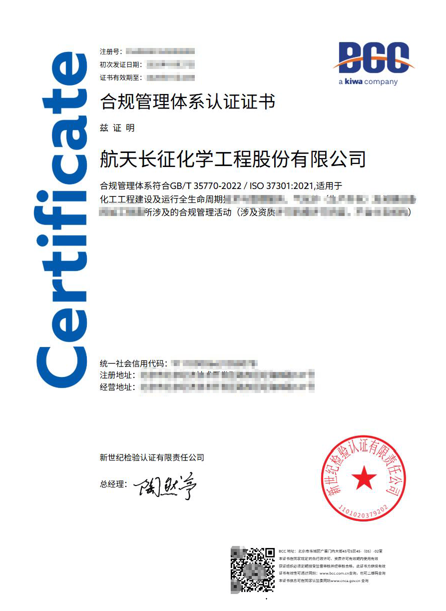 近日,新世紀檢驗認證有限責任公司(Kiwa BCC)派出審核組為航天長征化學工程股份有限公司(下簡稱航天工程公司)實施合規(guī)管理體系認證審核。
