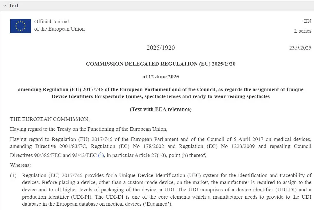 近日,歐盟官方期刊(OJ EU)發(fā)布了《歐盟委員會授權(quán)法規(guī)(EU)2025/1920》,對《醫(yī)療器械法規(guī) (EU) 2017/745》(MDR)中關(guān)于眼鏡框架、眼鏡鏡片和即戴式老花鏡的唯一器械標(biāo)識(UDI)要求進(jìn)行了重要修訂。
