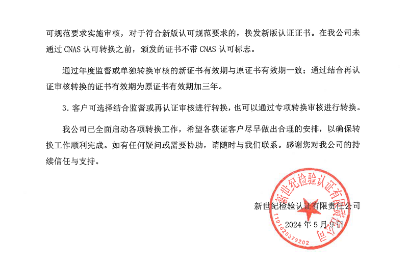 2.2024年6月1日起,我公司不再實施基于舊版認可規(guī)范的審核,開始按照新版認可規(guī)范要求實施審核,對于符合新版認可規(guī)范要求的,換發(fā)新版認證證書。在我公司未通過CNAS認可轉換之前,頒發(fā)的證書不帶CNAS認可標志。