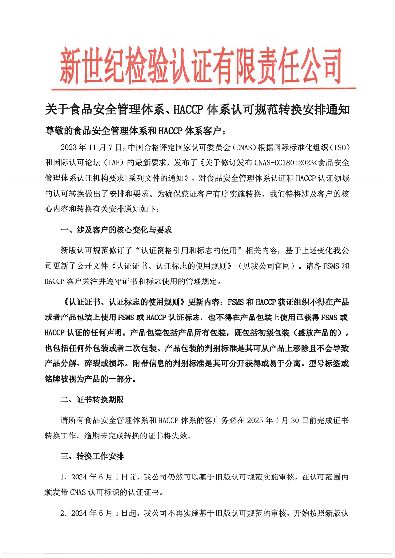 關于食品安全管理體系、HACCP體系認可規(guī)范轉換安排通知